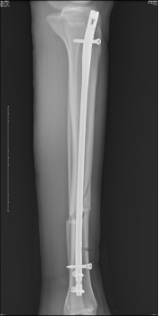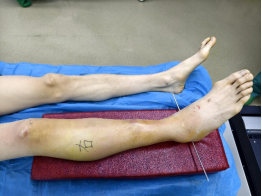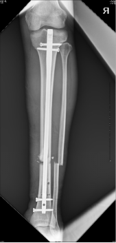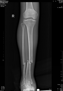 患者,男,22歲,車禍致右小腿疼痛腫脹,經(jīng)X片檢查提示:右脛腓骨折骨折。